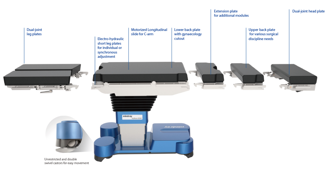 Engineered for increasingly complex surgical scenes, HyBase 8300/8500 comes with extreme weight capacity up to 460 kg guaranteeing highest safety and stability in any position. With longitudinal slide up to 480 mm, it is ideally suitable for cardiovascular surgery with C-arm. The modular design tabletop enables it to be tailored for various surgical discipline needs.