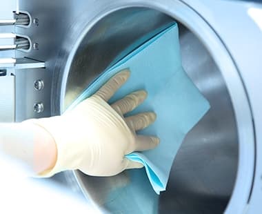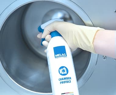 Open the door of your autoclave, switch it off and allow it to cool down. Then apply approx. 17 sprays of Chamber Protect Spray to the lint-free cloth and use it to clean the stainless steel surface of the inside of the door and the chamber.