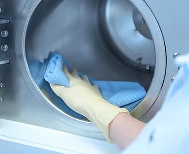 Finally, dry the stainless steel surfaces of the inside of the door and the entire chamber thoroughly with the blue microfibre cloth. The autoclave is now available again for sterilising the instruments.