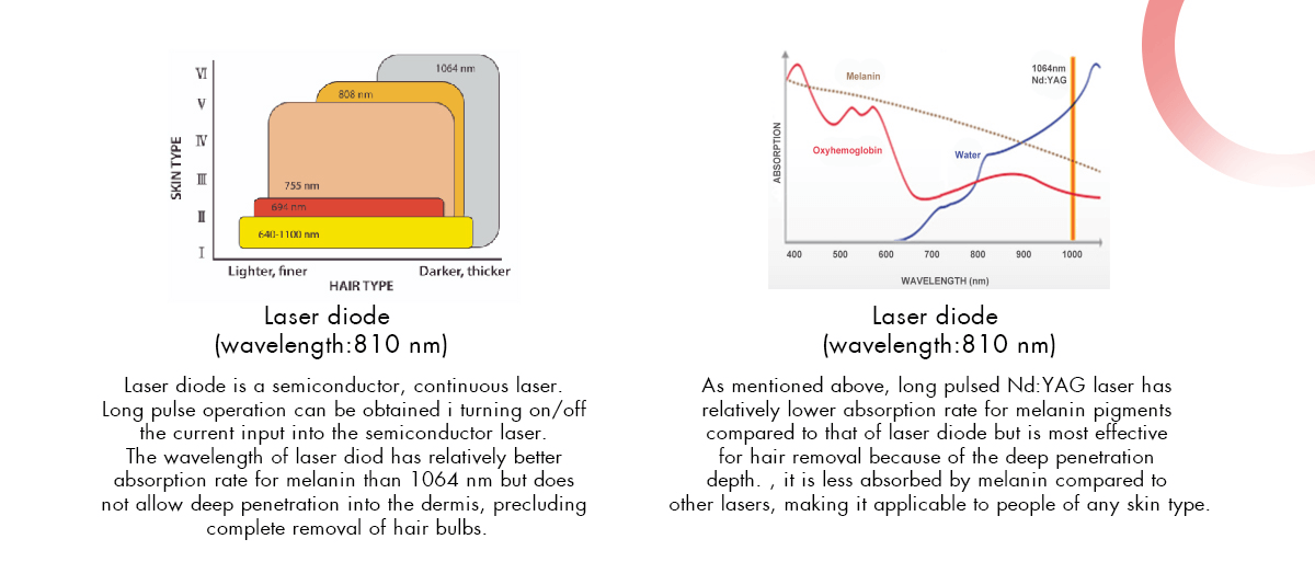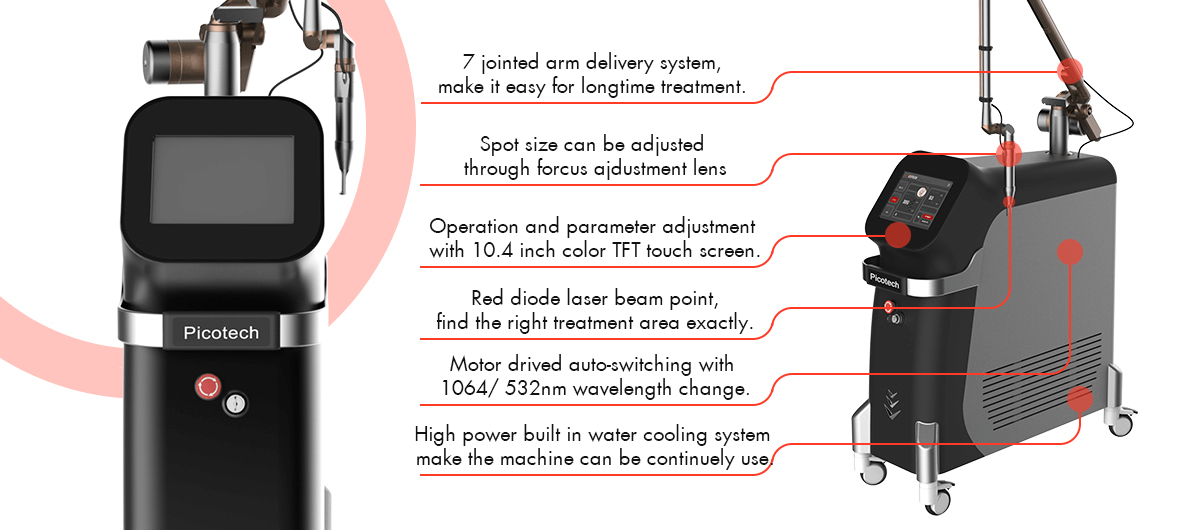 Utilizing the explosive effect of the Nd: YAG laser, the laser permeate the epidermis into the dermis which includes amount of pigment mass. Since the laser pulses in nanosecond but with super high energy, the shot pigment mass swell quickly and breaks into small pieces, which will be eliminated through metabolic system.