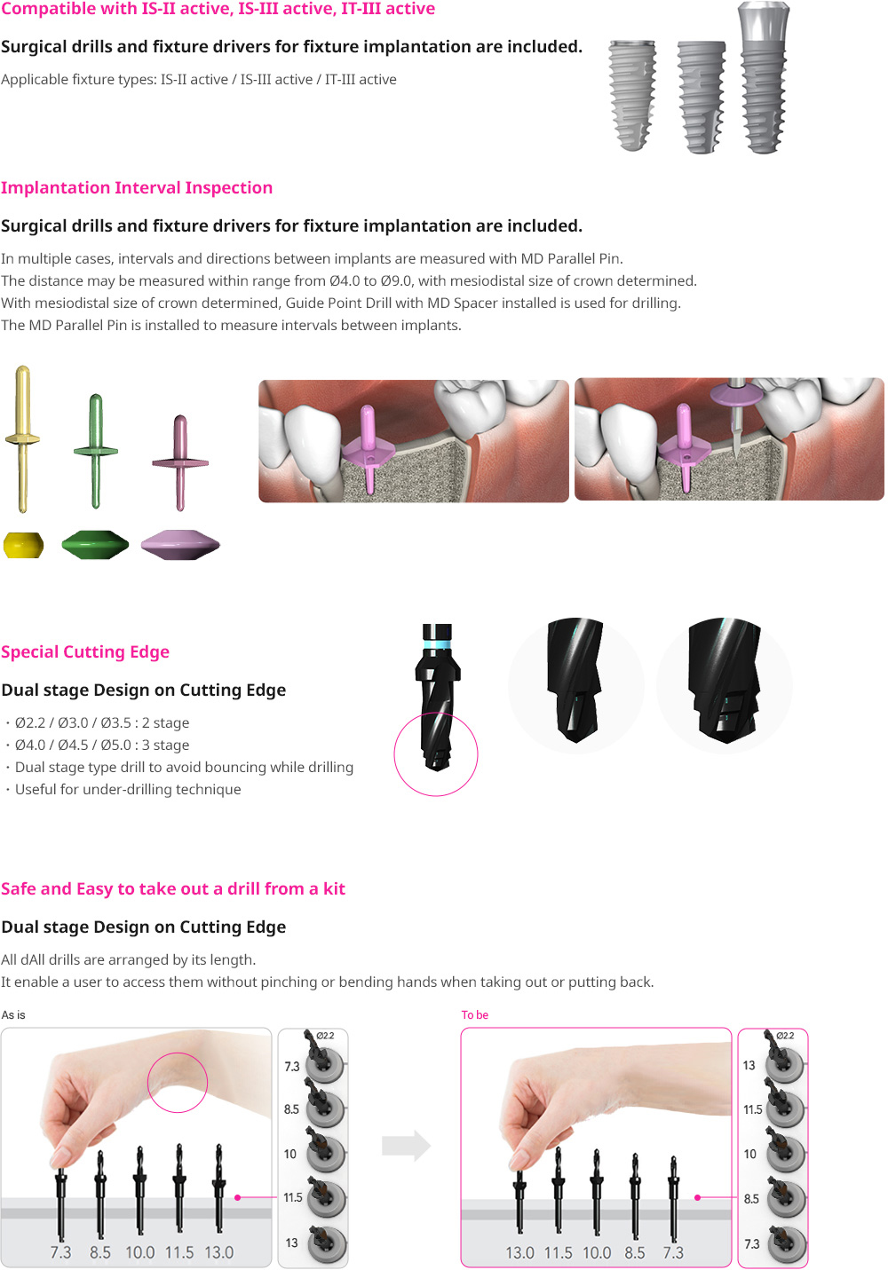 In multiple cases, intervals and directions between implants are measured with MD Parallel Pin. The distance may be measured within range from 24.0 to 09.0, with mesiodistal size of crown determined. With mesiodistal size of crown determined, Guide Point Drill with MD Spacer installed is used for drilling. The MD Parallel Pin is installed to measure intervals between implants.