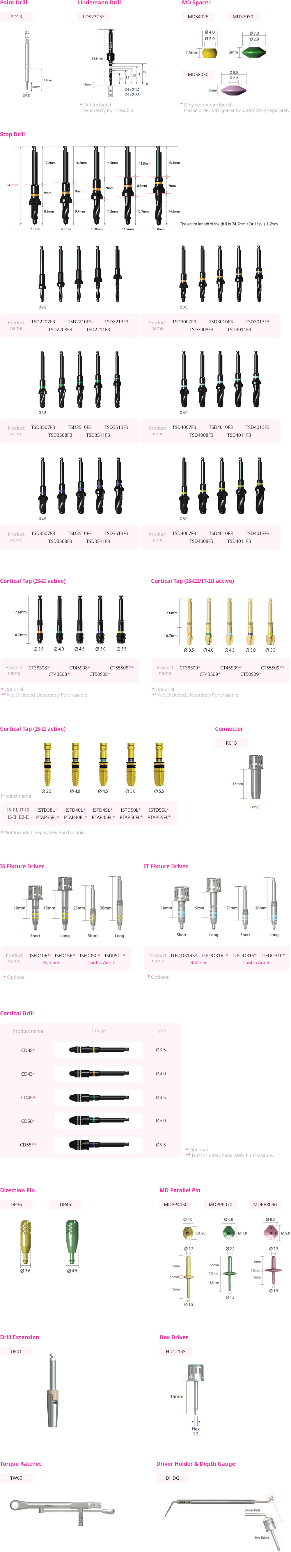Stop drills are stopper integrated surgical drills. Full drill line-up per length and diameter maximize convenience and requires no need of additional stopper installation.