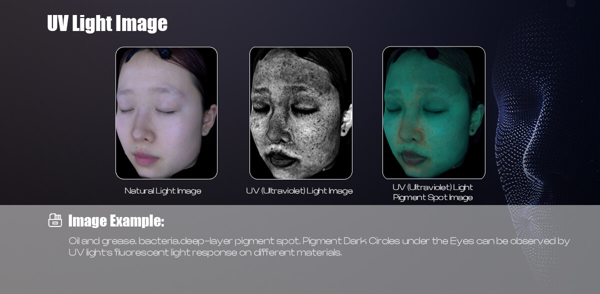 - In UV light, there are Porphyrin Imaging, Propionibacterium Acnes, Pityrosporum