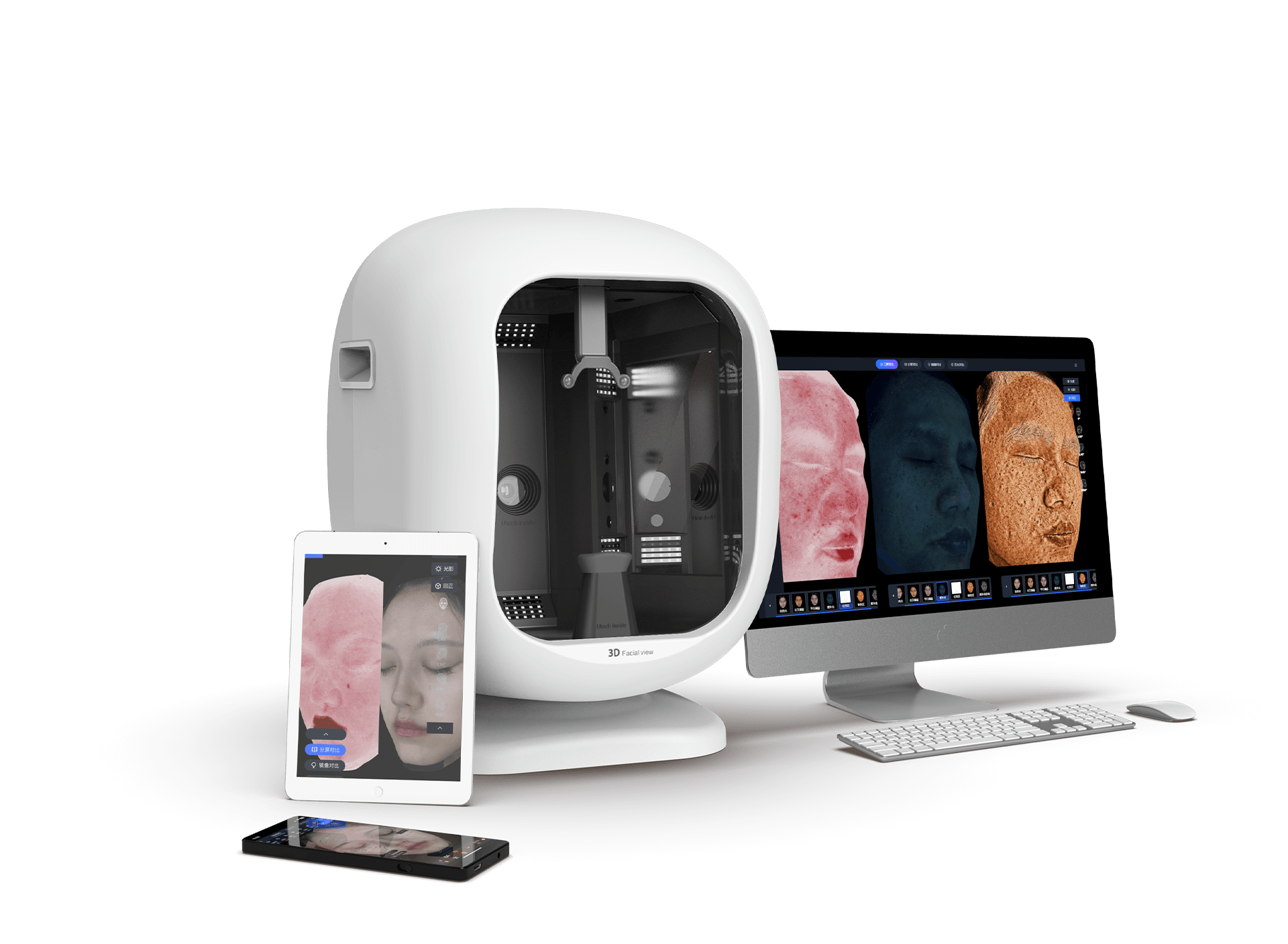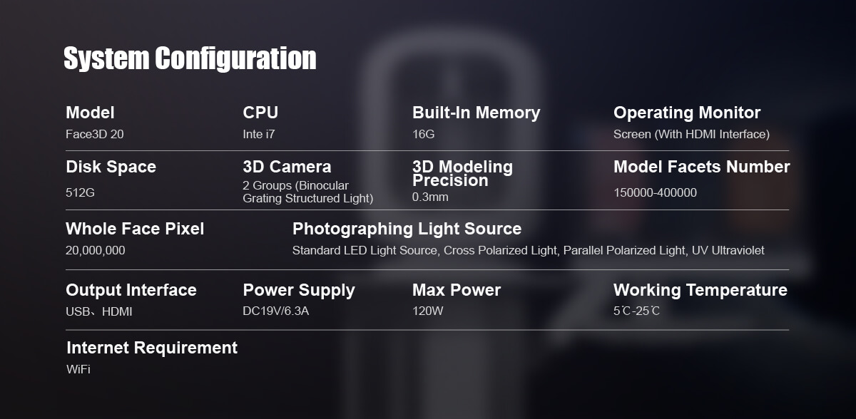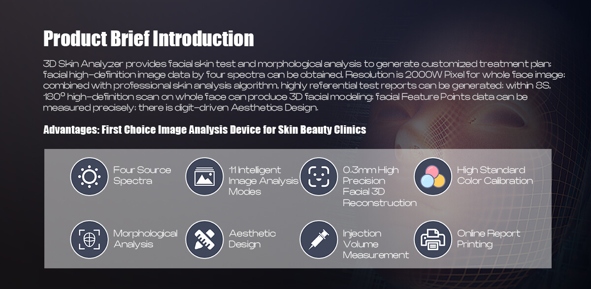 3D Skin Analyzer provides facial skin test and morphological analysis to generate customized treatment plan: facial high-definition image data by four spectra can be obtained, Resolution is 2000W Pixel for whole face image: combined with professional skin analysis algorithm, highly referential test reports can be generated: within 8S. 180° high-definition scan on whole face can produce 3D facial modeling: facial Feature Points data can be measured precisely: there is digit-driven Aesthetics Design.