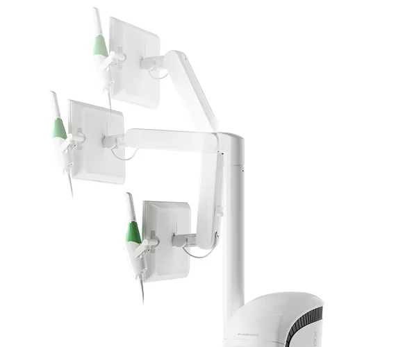 Mounted on a 50 cm monitor arm, the high-quality touch screen of Planmeca Imprex can be easily positioned to suit different working positions from 9 to 15 o’clock. The height, angle and position of the touch screen can be adjusted to support optimal scanning ergonomics, regardless of whether your are sitting or standing or right- or left-handed. Supported by a tripod instead of four legs, the scanning station seamlessly fits into various clinic layouts without legs getting in the way of the dental team. The raised legs also allow you to position your feet comfortably beneath the tripod.