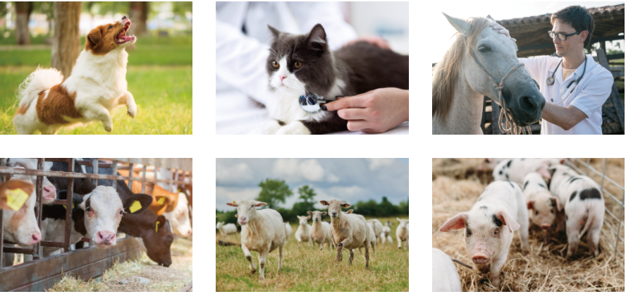 -Support dogs (large, medium, small), cats, cows, sheep, pigs, etc.