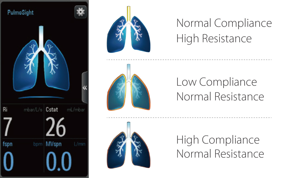 -PulmoSight graphically dispalys resistance, compliance and breathing state