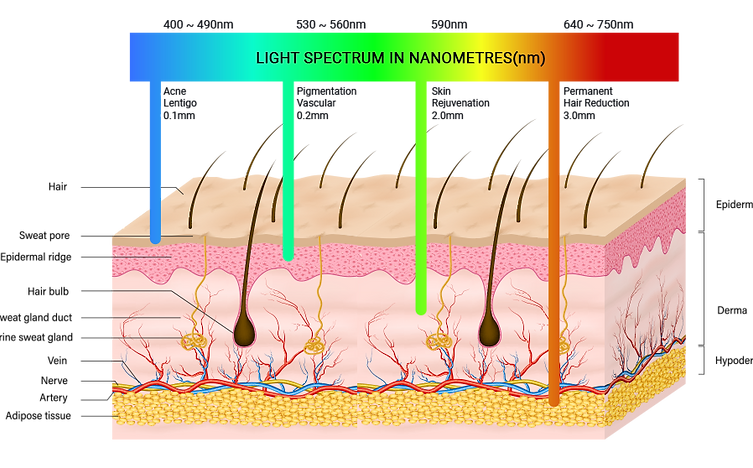 -Wavelength :415, 530, 560, 590, 640. 690, 755 nm (IPL - Xenon lamp)