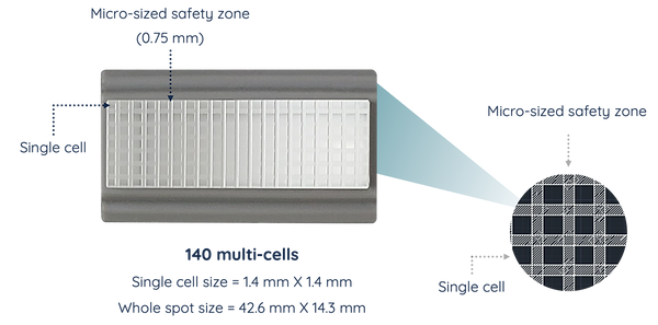 Multi-cell technology utilizes a sapphire filter with a micro-sized lattice structure to effectively contain light energy within individual cells, creating a square-outline safety zone between adjacent cells. This design helps preserve intact healthy tissues within the safety zone, following a fractional concept for enhanced precision. Additionally, it ensures safe treatment for patients with tanned or dark skin.