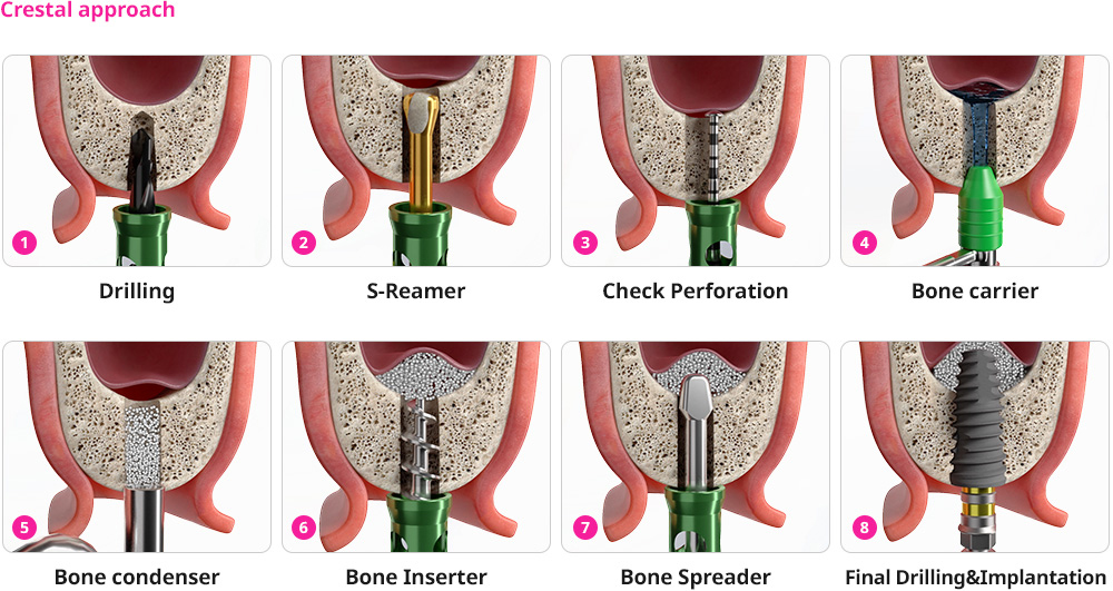 Sinus Crestal Approach kit is a surgical tool for sinus elevation by perforation inferior cortical wall and lifting sinus membrane without any membrane tearing.