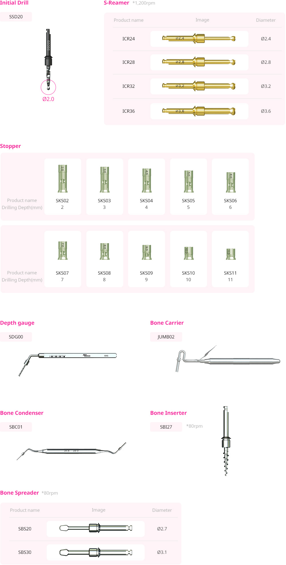 • Spreading the bone and reduce pressure in sinus area. 80rpm speed.