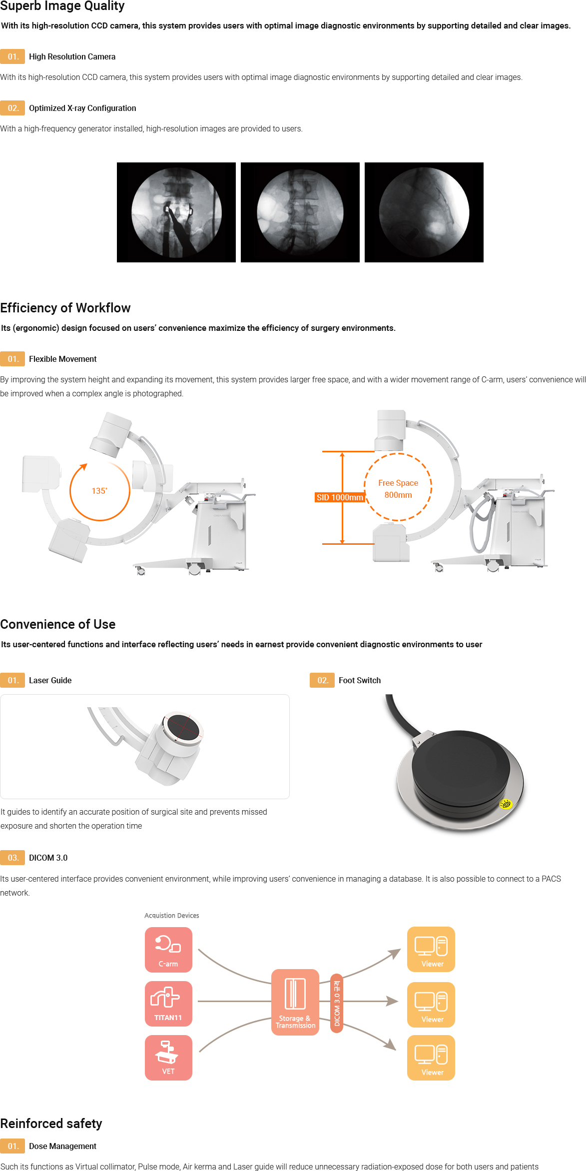 - By improving the system height and expanding its movement, this system provides larger free space, and with a wider movement range of the C-arm, users' convenience will be improved when a complex angle is photographed.