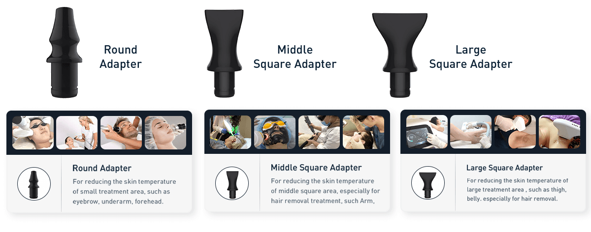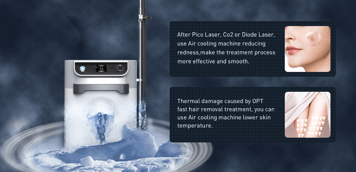 Skin Air Cooling is designed for reducing pains, redness, swelling and thermal damages caused by laser treatment, Intense Light (IPL) treatment and Radio frequency (RF) treatment .