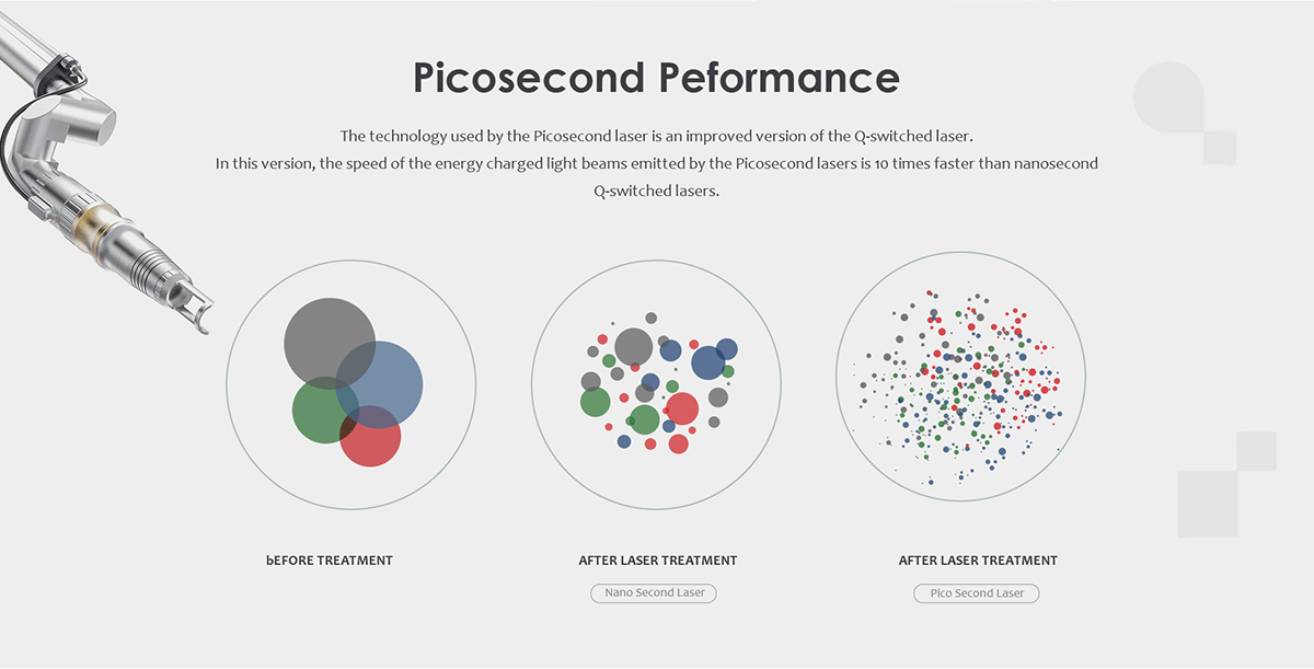 Utilizing the explosive effect of the Nd: YAG laser, the laser permeate the epidermis into the dermis which includes amount of pigment mass. Since the laser pulses in nanosecond but with super high energy, the shot pigment mass swell quickly and breaks into small pieces, which will be eliminated through metabolic system.