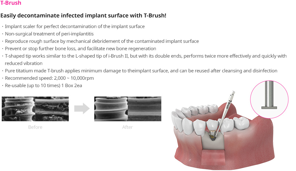 -Pure titatium made T-brush applies minimum damage to theimplant surface, and can be reused after cleansing and disinfection