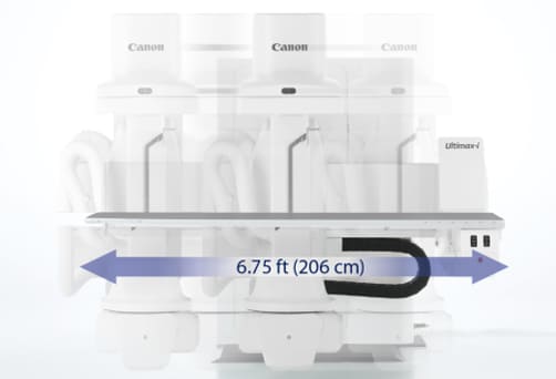 With a longitudinal C-arm movement range of 64 in (163 cm) and a 17 x 17 in (43 x 43 cm) detector, the Ultimax-i can easily achieve anatomical coverage greater than 6.5 feet (2 m).
