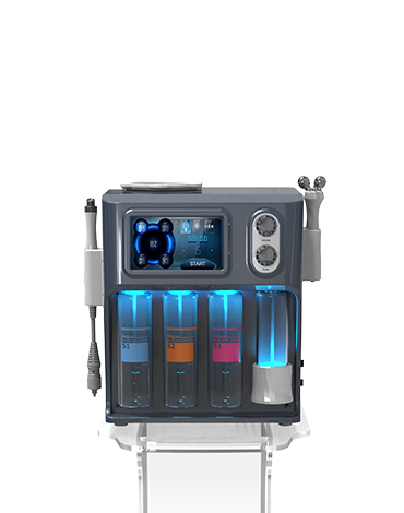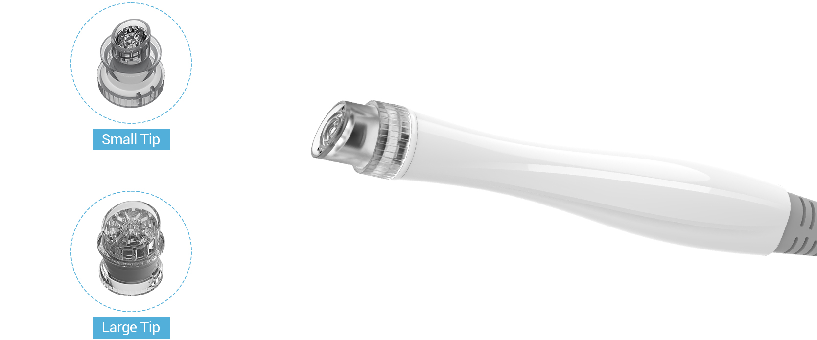 Aqua handpiece with Vacuum technology and specialized radial tips to exfoliate, cleanse pores, and dissolve impurities without skin irritation.