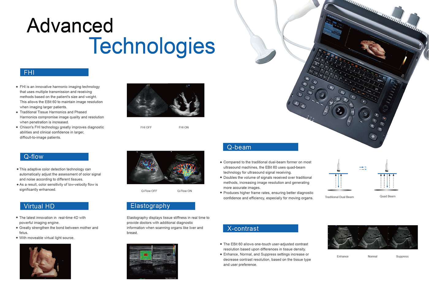 The EBit provides all the power you need for today´s challenging clinical environment, yet remain ultra-portable, ultra-affordable. With it´s cutting-edge imaging technologies, precise and intuitive workflow, ergonomic and eco-friendly design, versatile transducers for all applications from top to toe, we firmly believe the EBit to be the very best portable ultrasound in its class today.