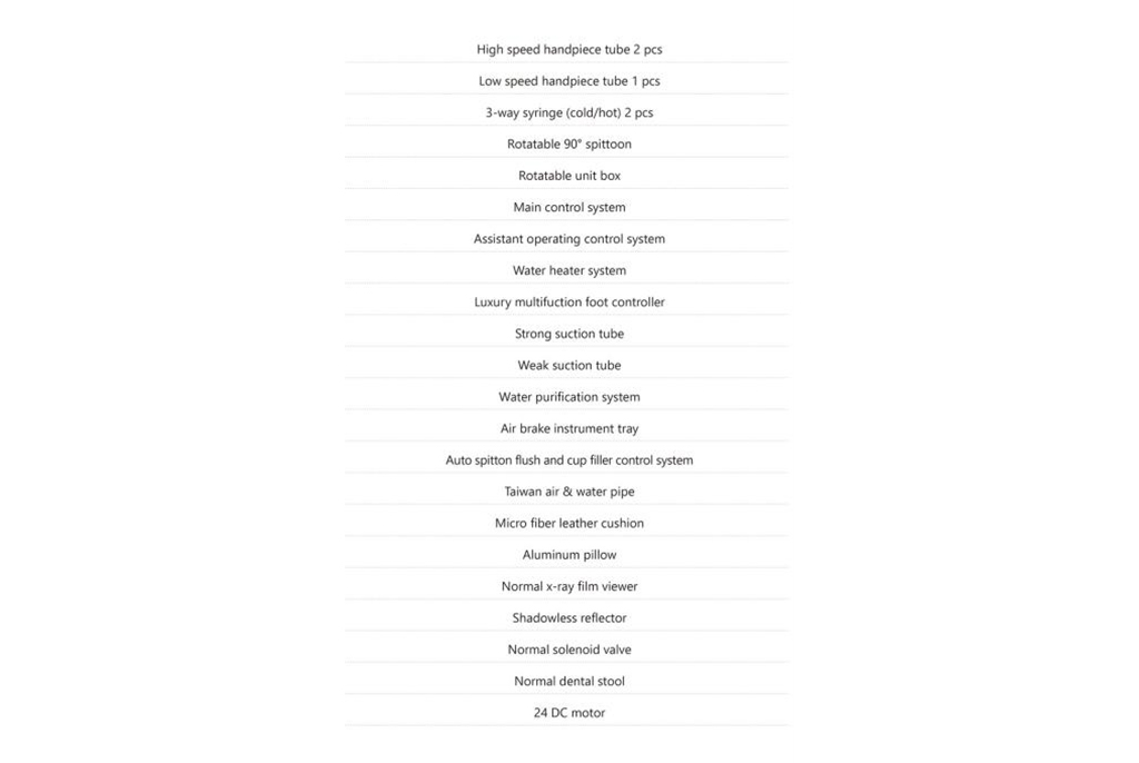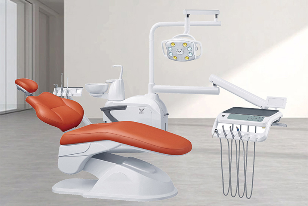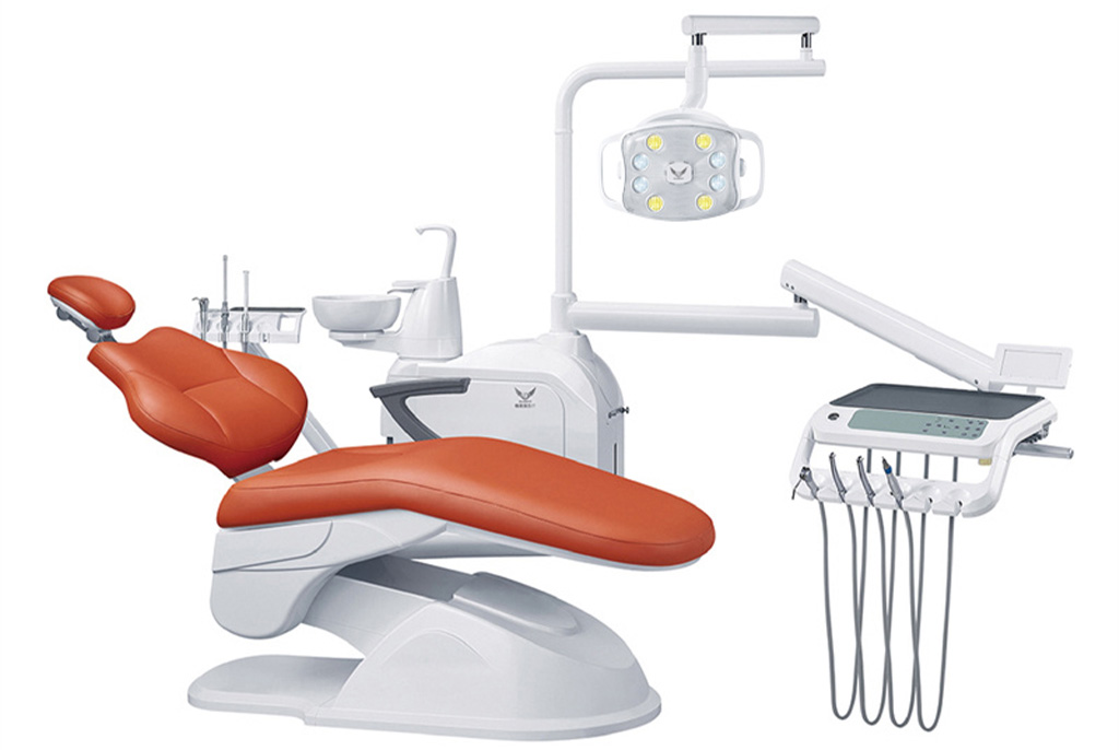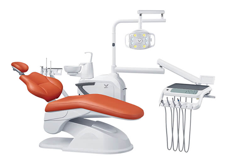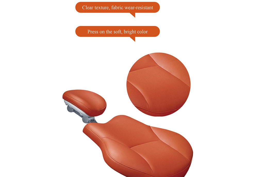 The metal backrest paired with a cast aluminum headrest offers both durability and comfort. Equipped with branded water and air pipes and a high-performance motor, it ensures stable operation. The multifunctional instrument tray is easy to use. The self-developed 8-hole tri-color patented oral light provides excellent illumination. The external detachable saliva ejector with a collection cup makes cleaning convenient. The ultra-fiber leather cushion delivers a comfortable experience for patients, making it an ideal choice for dental care.
