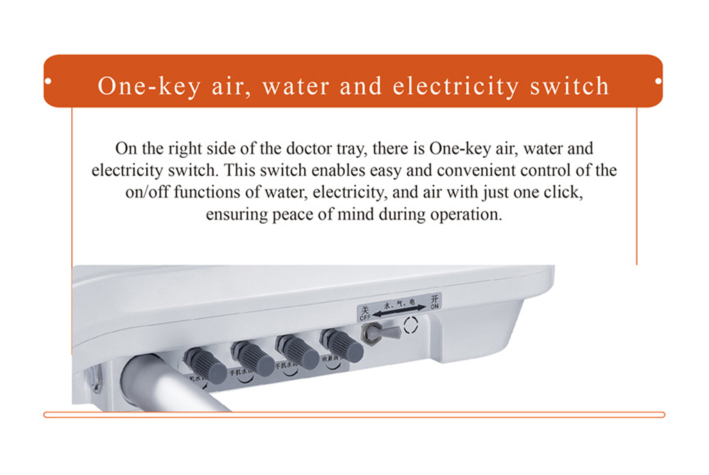 On the right side of the doctor tray, there is One-key air, water and electricity switch. This switch enables easy and convenient control of theon/off functions of water, electricity, and air with just one click,ensuring peace of mind during operation.