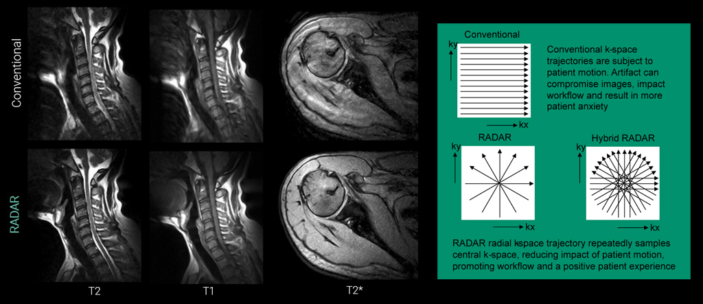 RADAR radial scan technology mitigates motion artifacts. Broadly applicable to sequences and anatomy, RADAR technology complements the open sided magnet to further promote patient comfort and scanner workflow.
