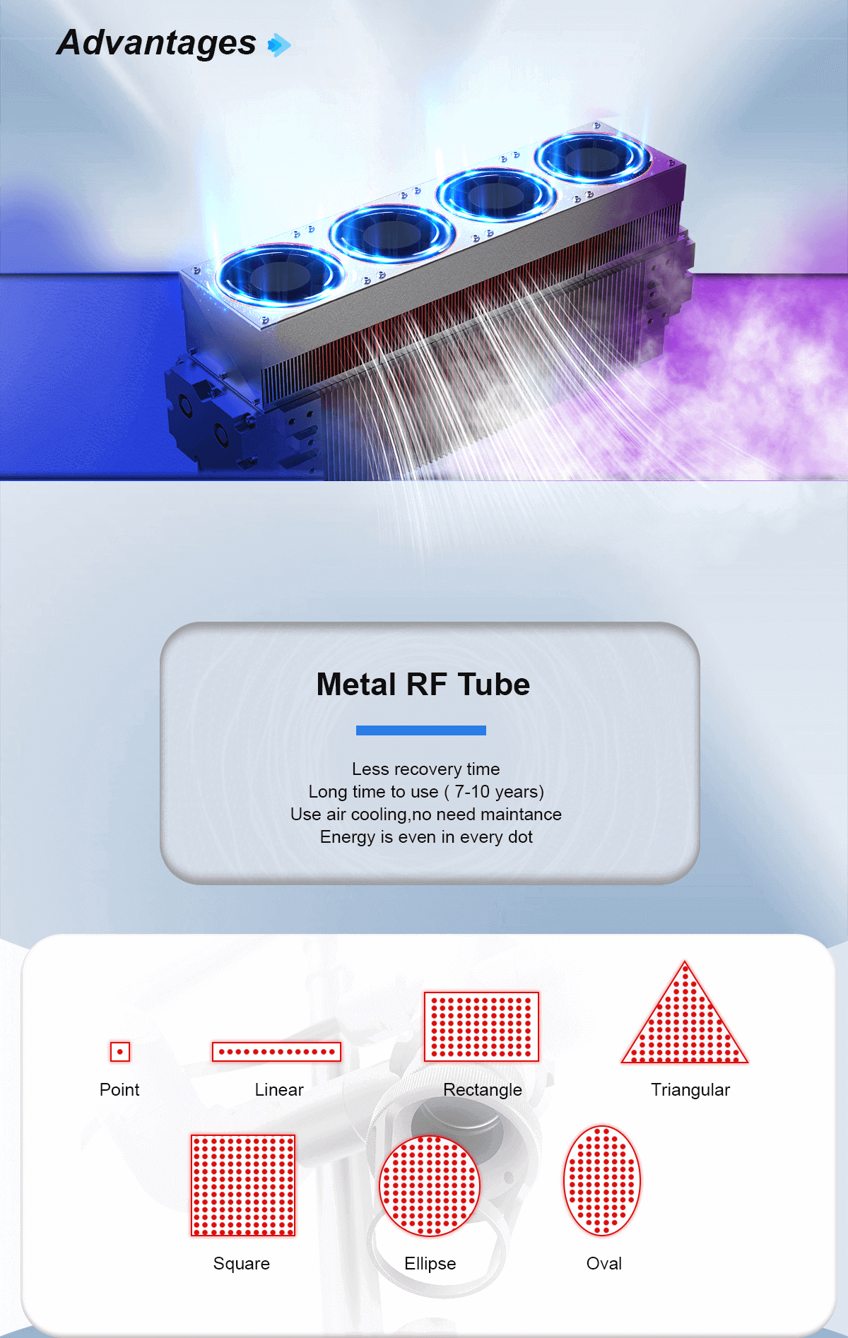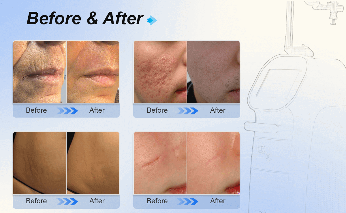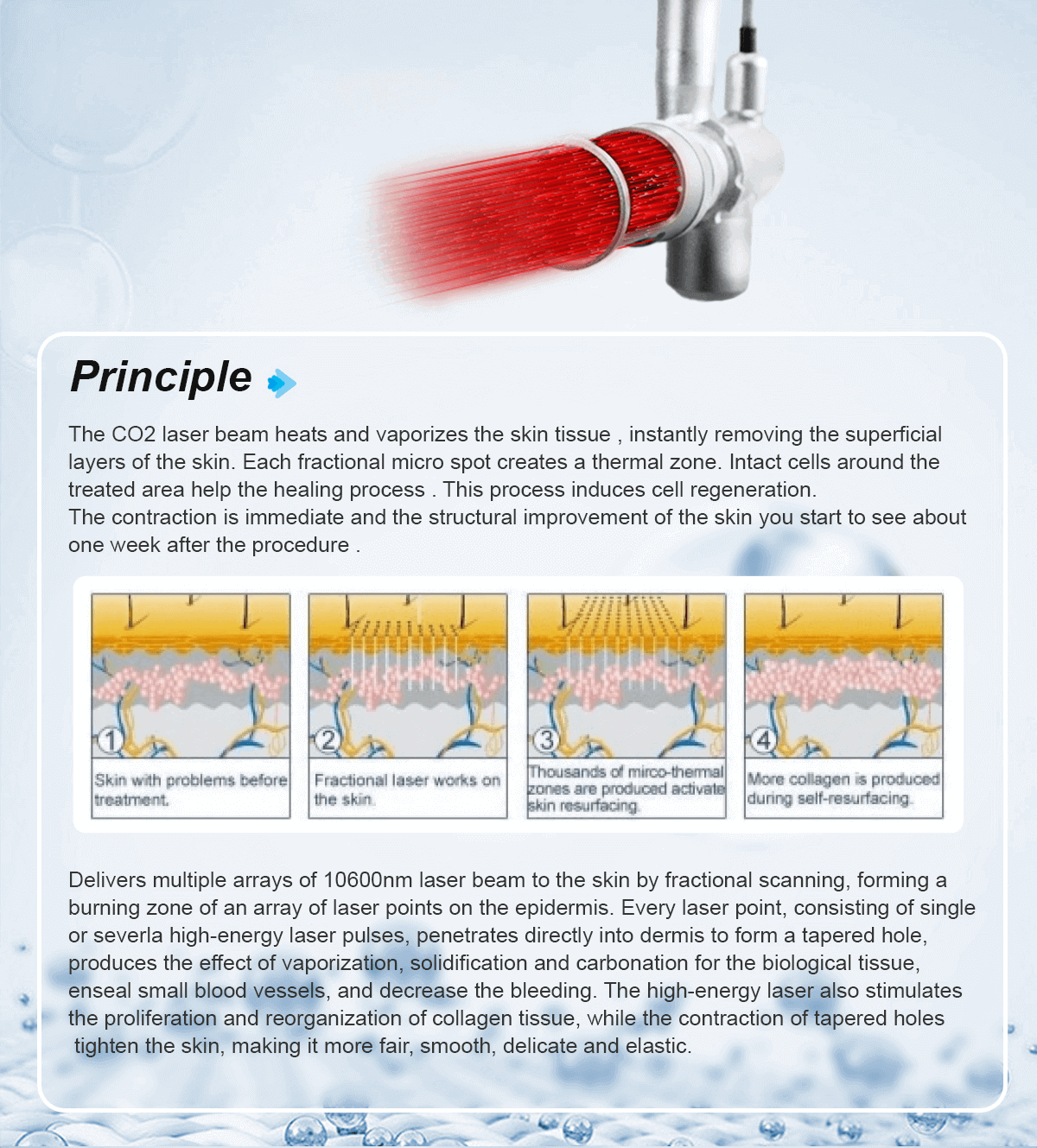 The CO2 laser beam heats and vaporizes the skin tissue , instantly removing the superficial layers of the skin. Each fractional micro spot creates a thermal zone. Intact cells around the treated area help the healing process . This process induces cell regeneration.