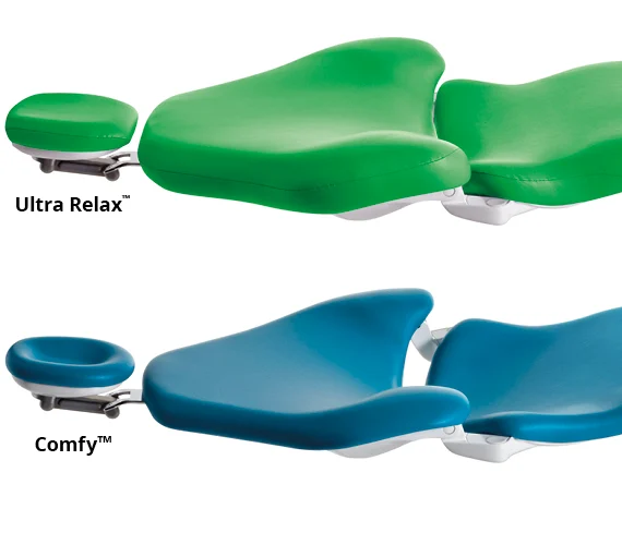 – even through longer visits. The chair design follows the shape of the patient’s body and provides firm support, while the double-articulated headrest allows comfortable positioning of the patient’s head. Armrests can be fitted for additional support. The Ultra Relax™ upholstery, made of durable artificial leather and viscoelastic memory foam, guarantees extra comfort.