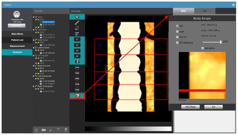 Utilizing the AUTO-ROI setting, you can obtain more precise BMD of AP Spine, Femur and Forearm. You can measure an abdomen fat thickness, as well.