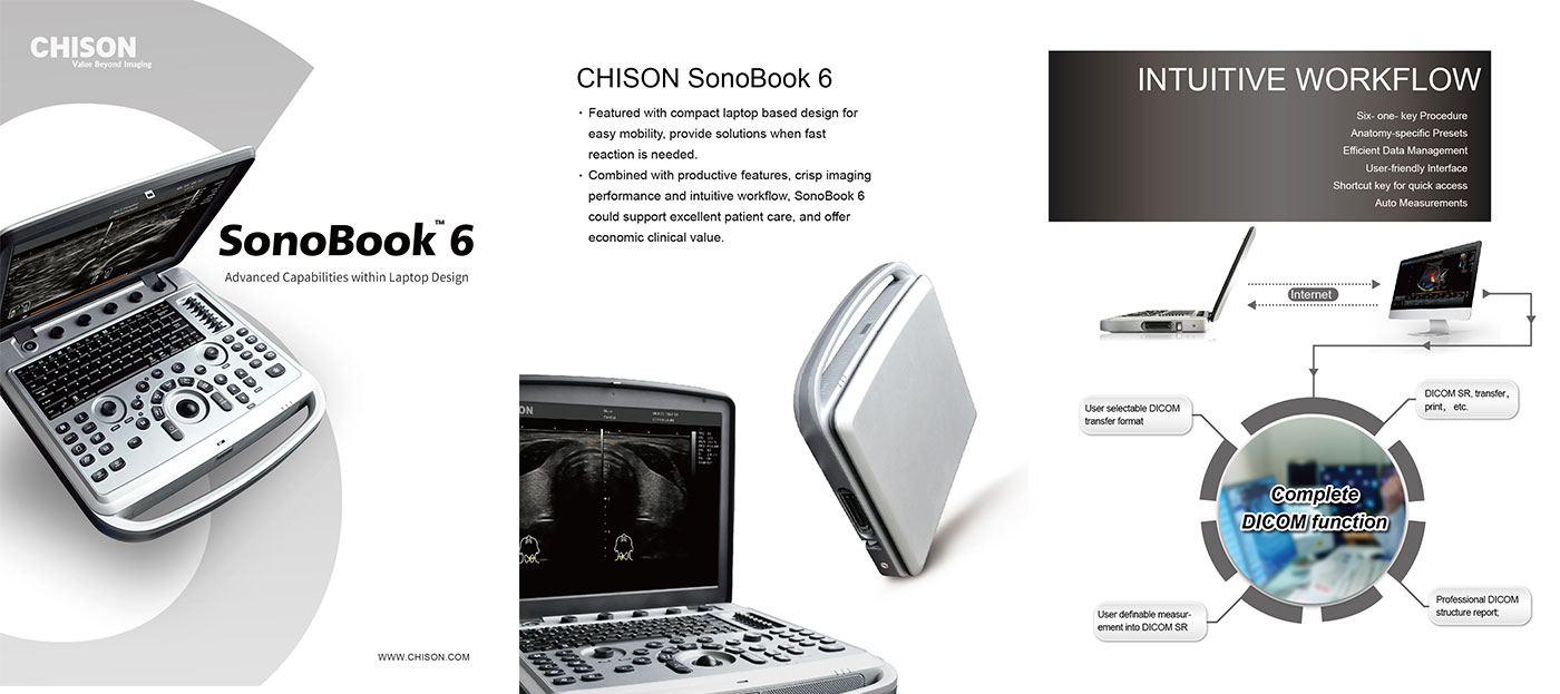 CHISON SonoBook 6 is featured with compact laptop based design for easy mobility, providing solutions when fast reaction is needed. Combined with productivity features, crisp imaging performance and intuitive workflow, SonoBook 6 could support excellent patient care, offering economic clinical value.